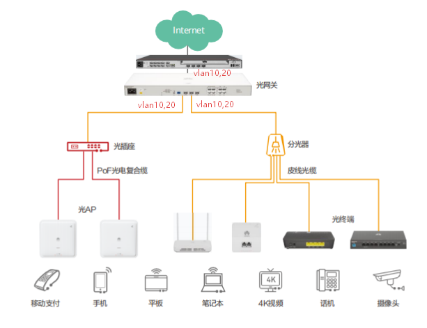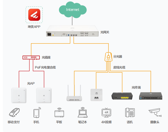 光OLT做网关,出口直接接光网关上,只要光网关连上互联网,通过APP扫码上线,就可以配置网络,跟wifi上网