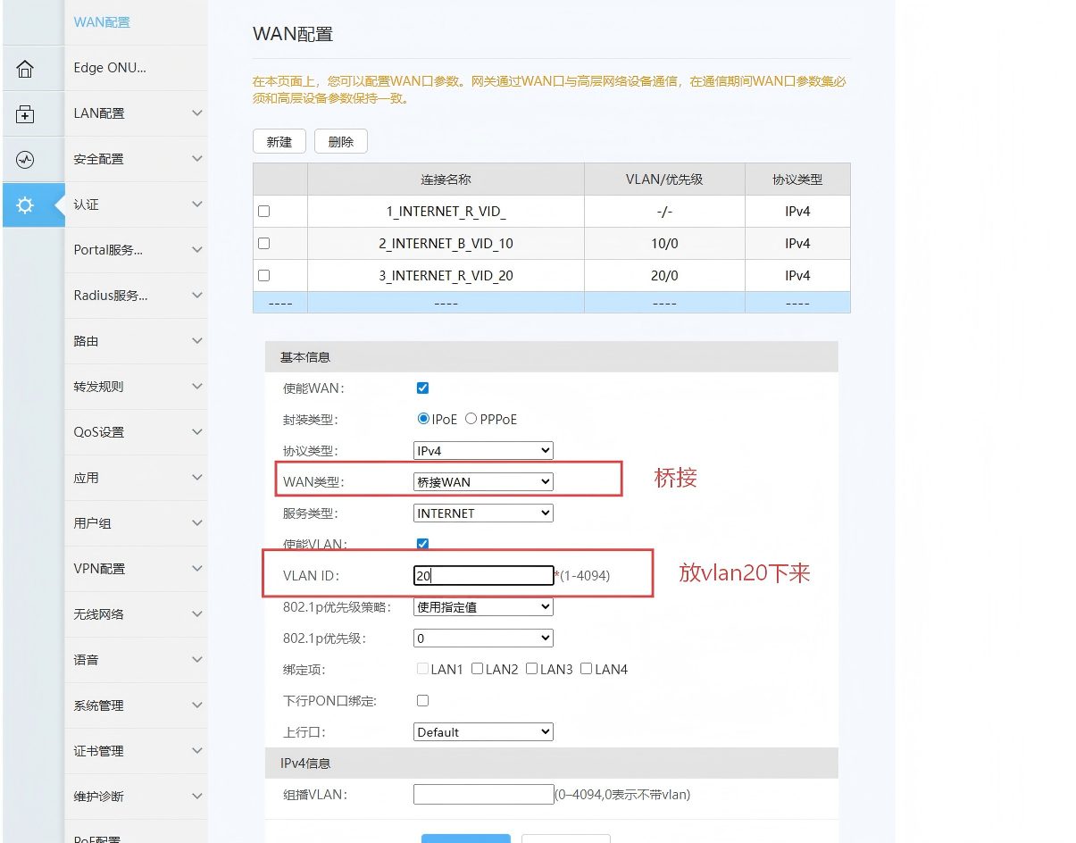 第一步,要放通上层vlan10,20,通过上联口做桥接如下。下面是绑定vlan20例子,vlan10也是一样步骤