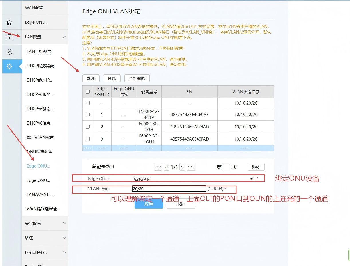 第三步,ONU绑定无线跟有线端口在vlan 下。下面是绑定vlan20例子,vlan10也是一样步骤