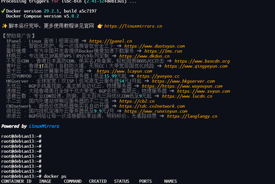 bash <(curl -sSL https://linuxmirrors.cn/docker.sh)